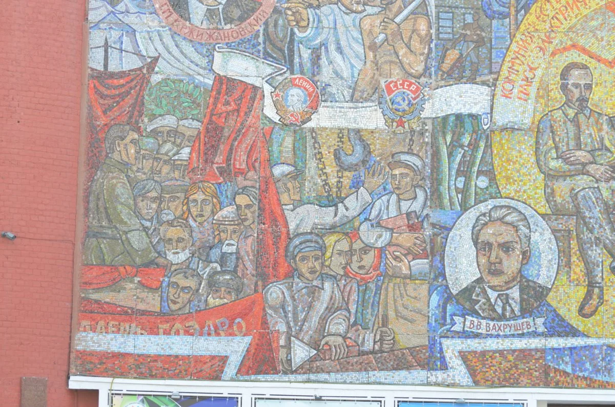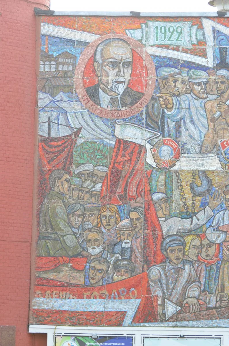 Конструктивистское здание клуба несет в своем убранстве – и фасада, и интерьера уникальное сочетание двух разных этапов и техник развития советской монументальной живописи. К полувековому юбилею плана ГОЭЛРО на центральной части фасада, вместо заложенных для этого оно появилось огромное мозаичное панно «50 лет первенцу электрификации СССР». Это огромная многофигурная композиция, выполненная из смальты в технике обратного набора – хорошо различимы монтажные швы между частями панно, очевидно мозаика такой площади была неординарной и с точки зрения сложности исполнения и проще было набрать её по частям в мастерской. Сюжет как таковой тут отсутствует, это скорее коллаж, отсылающей в своей манере к агитационному искусству начала 1920-х. В середине ростовые фигуры рабочего и крестьянки, рядом на стульях Владимир Ленин и Феликс Дзержинский, в круглых клеймах портреты главного автора проекта ГОЭЛРО Глеба Кржижановского и первого директора Каширской ГРЭС Василий Вахрушев, а с ними стилизованный под медальон Прометей. Фоном служат множественные изображения рабочих и инженеров – на митингах, в окружении труб и запорной арматуры, на фоне здания ГРЭС, над столом с чертежами и т.п.