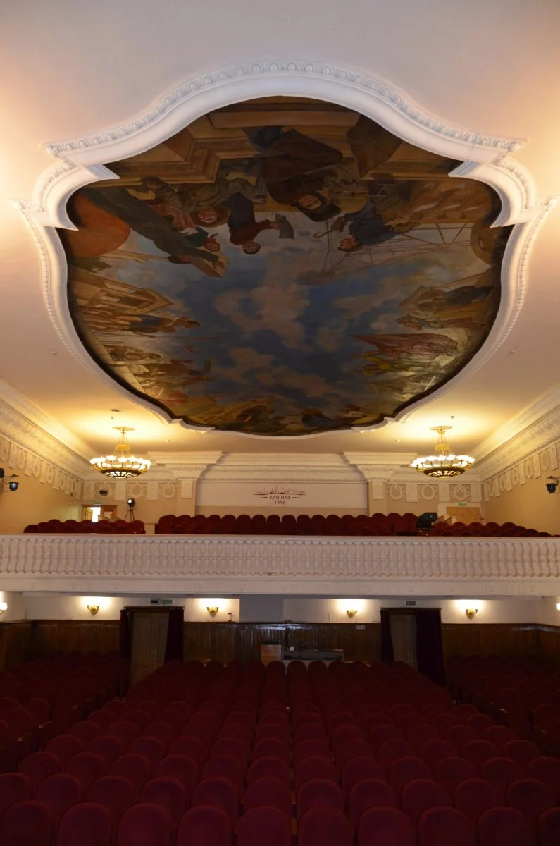 Внутри же, в главном зрительном зале в начале 1950-х, во время реконструкции интерьеров в духе послевоенного неоклассицизма был сделан расписной плафон. Порталы дверей, парапет балкона, карнизы зала, как и интерьер фойе с главной лестницей украшены богатым лепным декором – балясинами, гирляндами, круглыми медальонами, которым вторит деревянная обшивка нижней части стен, сделанная с тонкой профилировкой. Роспись занимает центральное место потолка зала и выполнена в духе барочных церковных росписей – с иллюзорным небом и тянущимися вверх зданиями и фигурами людей. Одно из зданий напоминает московскую высотку, второе – решетчатую башню вроде опор ЛЭП. Вокруг центральной части плафона, занятой синим неба с облаками танцующие и работающие люди – в манере, характерной для живописи социалистического реализма, с идеализацией образов, разнообразием национальных костюмов, воспеванием молодости и праздника.