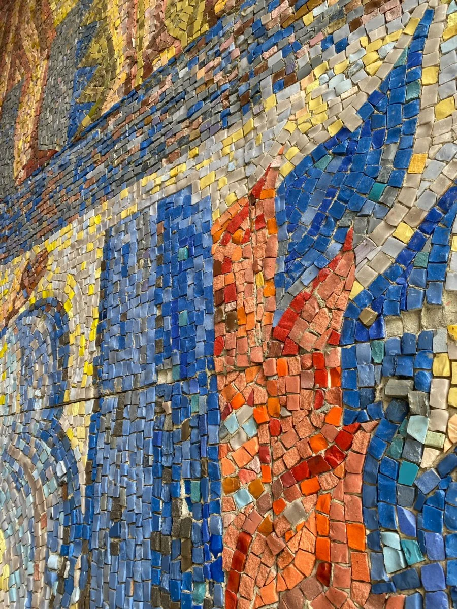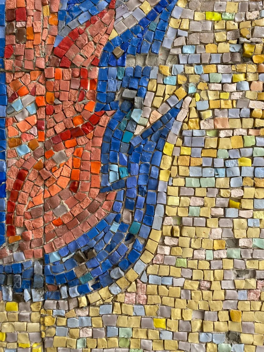 Панно «Ленин» в «суровом стиле» в двусветном фойе зрительного зала сделано по картонам самого архитектора здания, что в целом необычно. Выполнено оно из смальты в технике обратного набора и занимает целиком квадратную глухую стену в торце фойе. Сделана мозаика в красно-синей гамме с типичной для сурового стиля кубистической упрощенной моделировкой форм и дробным пестрым заполнением между основными элементами композиции. В строгом по оформлению – белая штукатурка и светлый мраморовидный известняк помещения мозаика остается единственным цветовым акцентом. Сам же набор сюжетов или вернее символов на панно достаточно типичный для мозаик, созданных в год столетнего юбилея вождя и основателя СССР и шестидесятилетия Октябрьской Революции. На светлом желтоватом фоне, сложенном из мозаики разных цветов – жёлтого, голубого, серого, оранжевого… помещен портрет Ленина на фоне красных полотнищ и в окружении отдельных сценок-фрагментов: троих революционных солдат, группы рабочих и работниц, солдата в форме Великой Отечественной Войны рядом с молодой матерью с младенцем, стилизованных изображений строек и заводов, дамбы ГЭС, крейсера «Аврора» и т.п. Общая графичность роднит эту мозаику и с графикой 1970х – открытками, конвертами, транспарантами и т.п. продукцией.