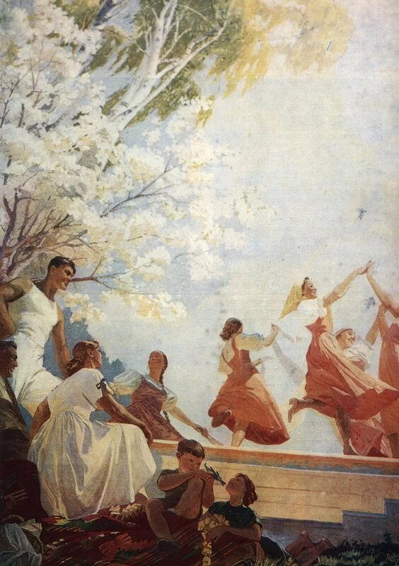 Роспись в стиле позднего социалистического модернизма сделана в плафоне плоского потолка зрительного зала занимает центральную прямоугольную часть, окружающие же её кессоны заняты орнаментами и фигурами спортсменов, выполненными в технике гризайли. В гризайли же сделаны два прямоугольных дессюдепорта – панно над боковым дверьми из зала в фойе. Сама главная роспись сделана в почти приторном духе социалистического реализма, ввиду сюжета, художница ориентировалась здесь даже не на барочную живопись или классицизм, а на рококо. Танцующие в центре композиции девушки напоминают своими движением, спиральными линиями и общей динамикой живописные в том числе декоративные полотна Ватто и Буше, однако и они, и помещенные в два угла росписи группы музыкантов и зрителей одеты, конечно, не как нимфы или французские придворные XVIII века. Мастерское владение колоритом и рисунком позволило художнице создать необходимый для сравнительно низкого зала иллюзию «прорыва» пространства. Неизбежные перспективные искажения умело скомпенсированы, а общая композиция распределяется на три отдельных группы. Общий сюжет, кроме цветения плодовых деревьев и свободного танца, не несет какого-либо развития или преодоления, а сами образы героев, особенно второстепенных – транслируют нормативность советского послевоенного общества: чтение книг, занятие спортом, мальчик с авиамоделью в руках и т.п.