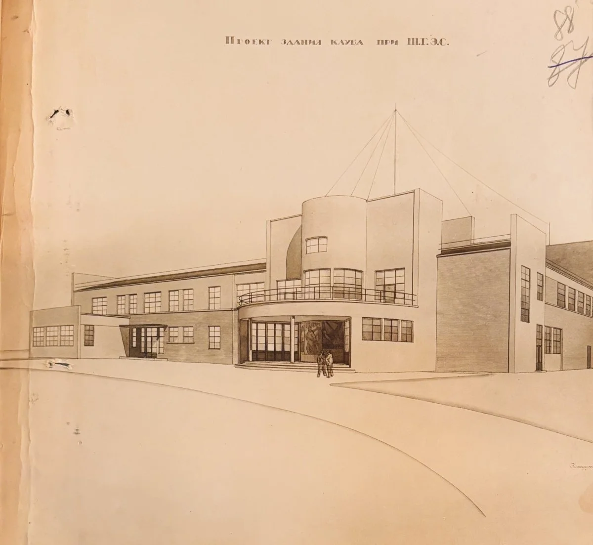 Первый вариант проекта представляет Г-образное в плане здание со скругленным углом и полуциркульным эркером читального зала на главном фасаде, все входы в здание также были оформлены полукруглыми эркерами и пристройками. Физкультурная площадка и сад, запроектированные Бржостовским рядом со зданием клуба, так же завершались полусферическими выступами. Такие «округлости» с одной стороны вписывали здание в городское пространство и учитывали форму расположенной рядом площади, а с другой, вероятно, сглаживали углы функциональной постройки и простых геометрических объемов клуба, спроектированного в рамках архитектуры современного движения и конструктивизма.