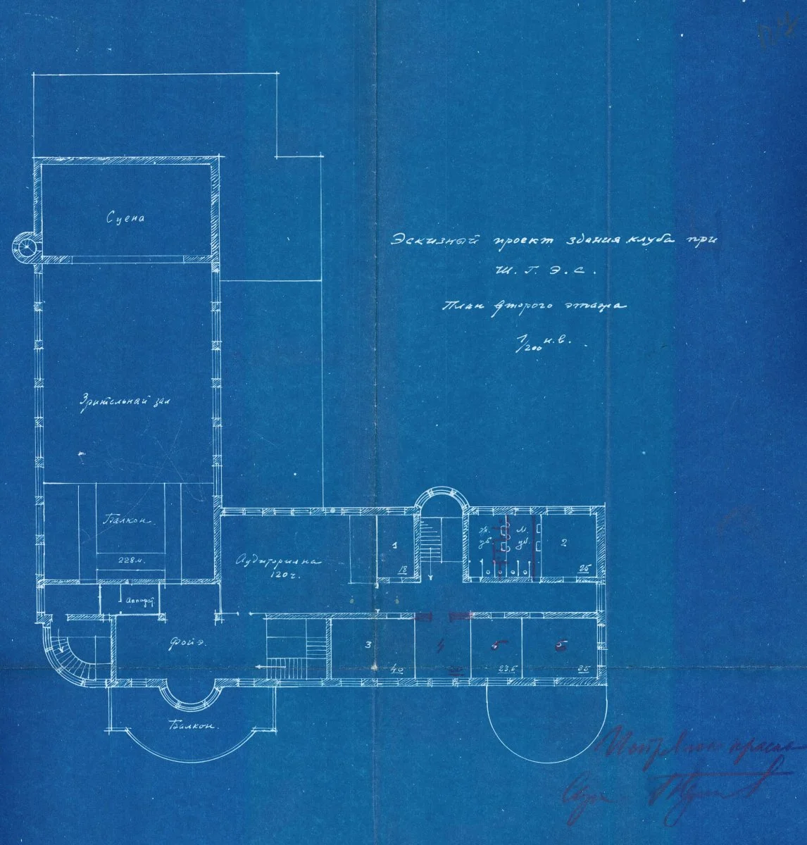Первый вариант, дошедший до нас лишь в светокопии плана, не был утвержден. Замечания, в основном, касались стоимости работ, выделенные средства не позволяли увеличить вместимость зрительного зала, поэтому было решено отказаться от спортивного, с пометкой, что проект будет предусматривать вторую очередь строительства, также неудобным оказалось дробление фойе перегородками. Но в итоге, архитектор отзеркалил план и расположил зрительный зал в корпусе, поставленном параллельно переулку, а клубную часть в главном объеме, обращенном на площадь. При этом из полуциркульных частей клуба осталась лишь форма главного входа в театральную часть с колоннадой, балконом, эркером и стеной-экраном.