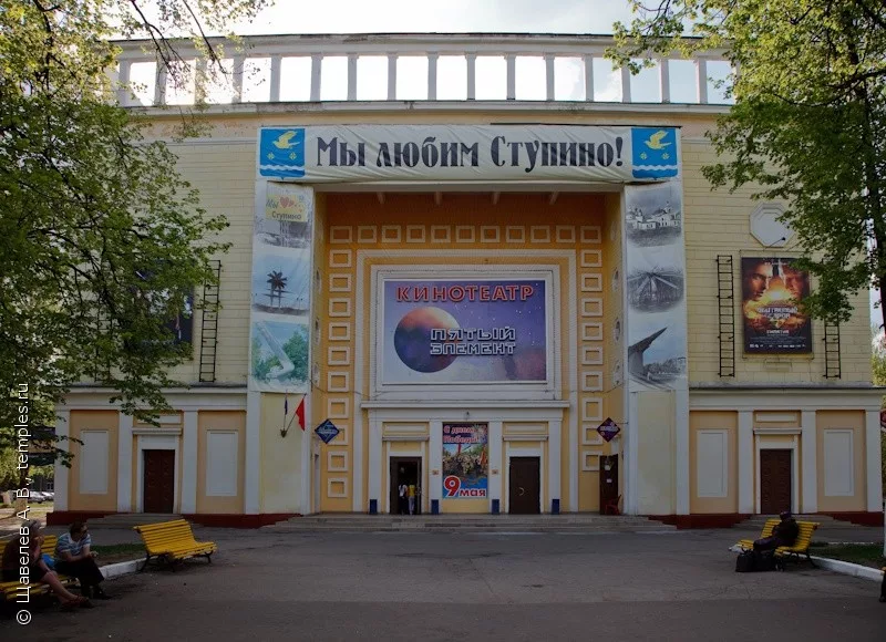 В оформлении кинотеатра в Ступино, так же, как и в других постройках, реализованных по этому проекту, использованы и классические, и авангардные элементы, что позволяет отнести его к архитектуре переходного периода – постконструктивизму. Геометрические членения главного фасада подчеркнуты плоскими пилястрами с капителями, высокими нишами, рамками входных проемов с прямыми сандриками. По периметру квадратной ниши-экрана помещены накладные ширинки, при этом откосы оформлены гранеными окнами-иллюминаторами, такие же ложные восьмигранники украшают пилоны. Продолжает композиционную вертикаль ограждение кровли с квадратными столбами и лежащим на них карнизом, что визуально делает несколько приземистый объем выше и стройнее.