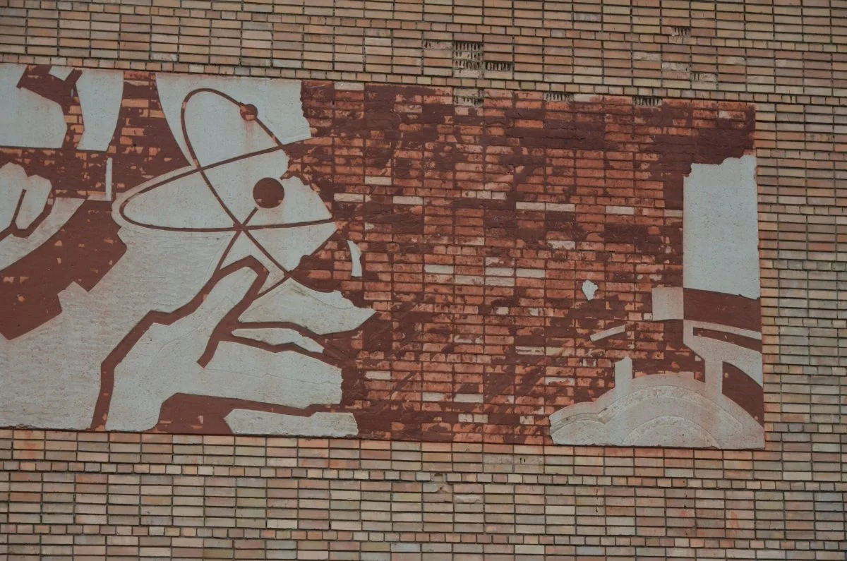 Типичный модернистский ДК ввиду нестандартности многих элементов строился не из сборного железобетона, а из кирпича с внутренним железобетонным каркасом. Компоновка здания асимметричная, основные функции – спортивный и большой зрительный залы занимают каждый свой большой объём. Такая компоновка была разработана ещё конструктивистами. В данном случае малый зал, используемый как танцевальный нависает над входом, образуя глубокую лоджию. Опорами служат овальные в сечении трапециевидно расширяющиеся к верху столбы – типичный образ архитектуры «оттепели». Большой витраж малого зала над входом когда-то был действительно цветным витражом, что встречалось в модернистской архитектуре достаточно часто – известней всего здания Дворца пионеров в Волгограде или ЗАГСа в Самаре. Так или иначе, вход предполагал не только вывеску-название, но какой-либо цветовой и художественный акцент. Таковой сохранился, но на правом фасаде, на глухой стене большого зала, где над небольшим зонтиком-козырьком дверей эвакуационного выхода сохранилось большое горизонтальное панно в технике сграффито. Поверх кирпичной кладки был нанесен слой штукатурки, в котором процарапывались рисунки, заполненные краской. Панно это понесло серьезные утраты и не всё легко считывается, сделано оно было в типичной для модернизма 1960-х манере (встречающейся не только в произведениях монументального искусства, но и в плакате и книжной графике) совмещения силуэтов. Слева направо мы видим изображение строительства – руку рабочего с мастерком, крюк и тросы крана с круглыми отверстиями многопустотной бетонной плиты, решетчатую вышку крана или лесов, потом, после утраченного фрагмента, руку с молотом на фоне шестеренки и в конце, раскрытую горизонтально ладонь с символом атома над ней. Даже по сохранившимся фрагментам видно основной «сюжет» — строительство объектов энергетики, от каменщика до атомщика.
