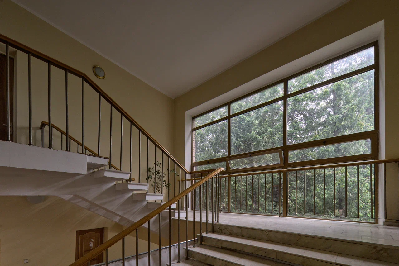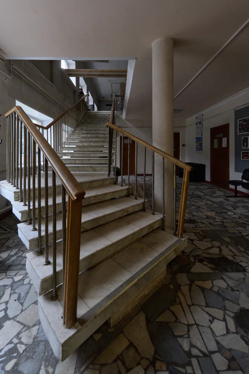 Внутри сравнительно небольшое фойе, гардероб, двери в большой зал и две лестницы. Левая ведет в спортивное крыло и кружковые помещения, два её марша сделаны под углом, сохранились деревянные перила с хромированными стойками. Эта лестница, ажурная и прозрачная как бы обходит цилиндр бетонного столба каркаса. В отделке фойе так же сохранилась облицовка пола мрамором разных цветов и нерегулярной формы. Сами же лестницы обшиты белым мрамором уральского карьера Коелга, использовавшегося в 1960-1970-е годы повсеместно – от надгробий до станций метро и общественных интерьеров. Вторая, главная, лестница в здании сделана шире и помещена в отдельный параллелепипед как бы приставленный к ДК справа. Здесь большое окно во всю стену, такие же тонкие стойки перил и ничем не скрытая структура бетонных ступеней без подступенков и косоуров под ними.