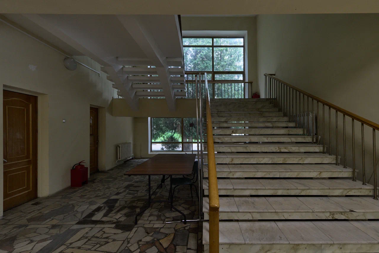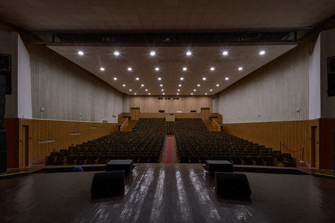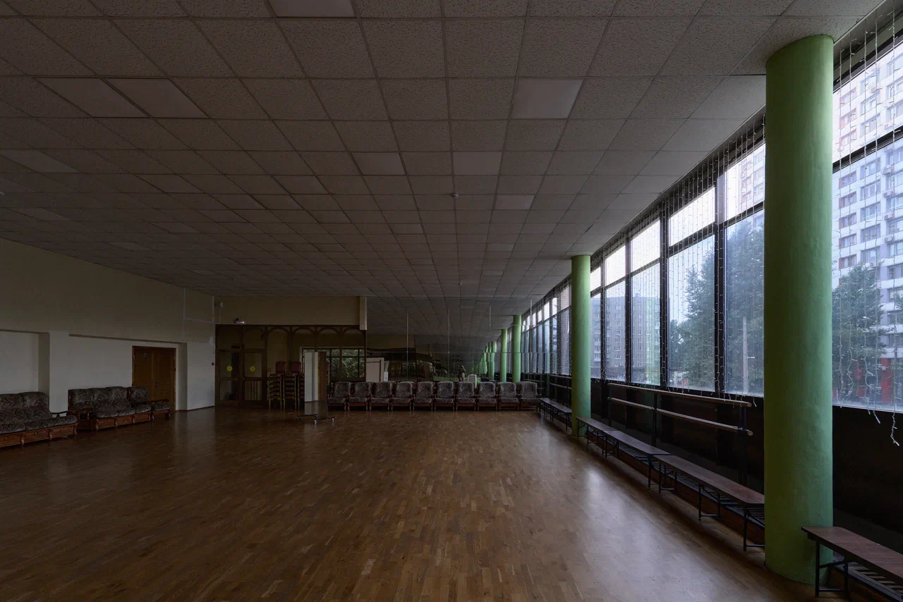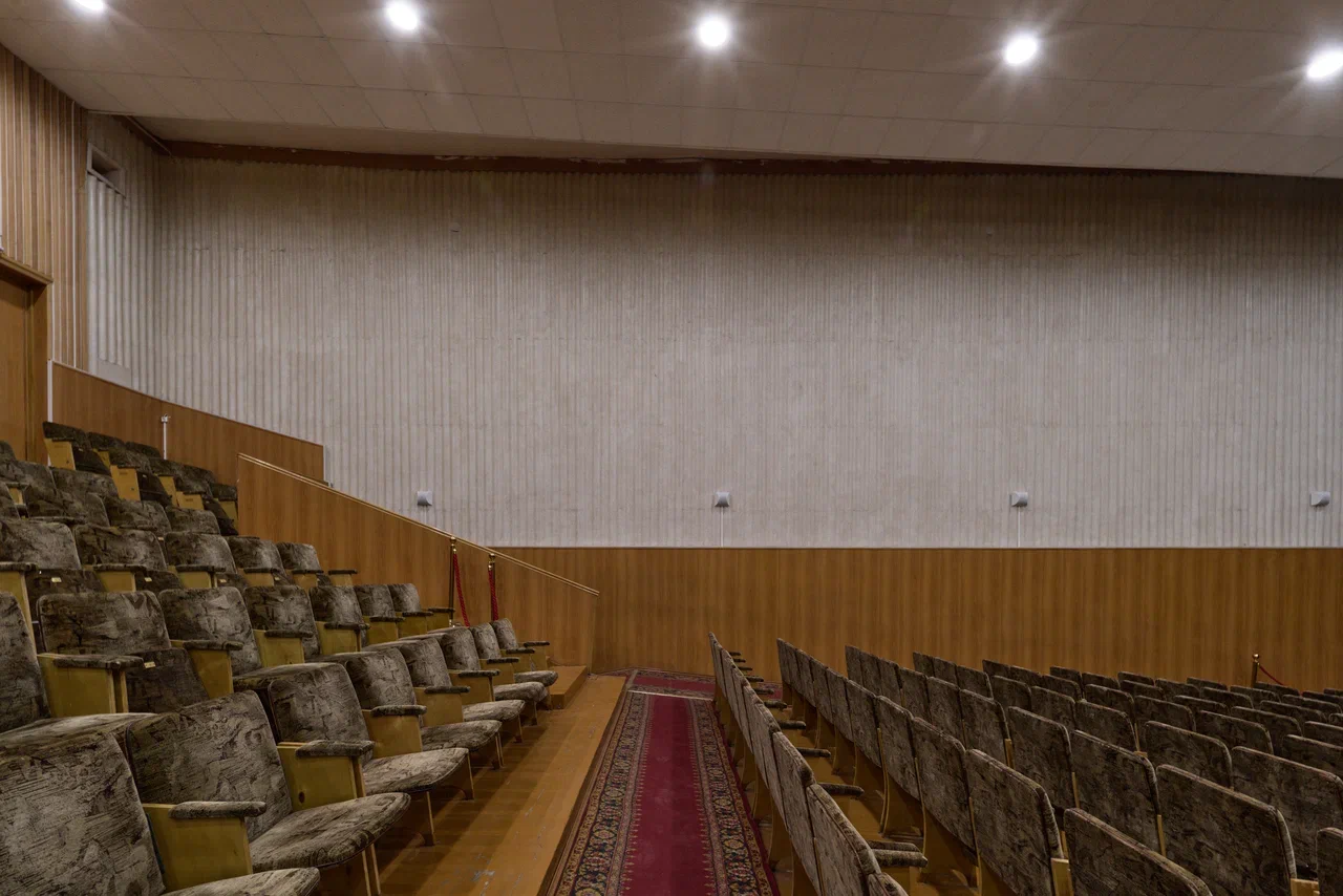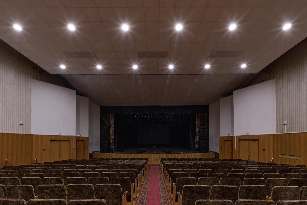 Спортивный зал слева представляет собой просто высокий параллелепипед, на длинных сторонах которого прорезаны по 7 больших окон между кирпичными ребрами-пилонами. Большой же зрительный зал окон лишён совсем, в плане он так же прямоугольный, в проекте на 600 мест, в настоящее время немного меньше. Стены обшиты снизу древесно-стружечными панелями, а сверху волнистыми плитами из гипсо-цемента. Всё очень строго и скромно, на фоне такого решения выделяется занавес – на ткань «с искрой» аэрографом нанесен пейзаж, стилизованный под акварель. Сшит занавес из полос и в нижней части центрального полотнища, и почти на всю высоту боковых нашиты так же нарочит неровные «оборки», с особенной, «мятой» фактурой. Боковые части выделяются также диагональными линиями – ветками и будто бы дымами, а центральная часть желтым цветом равнины. Пейзаж передает лиричное межсезонное настроение с волнами облаков, тумана, неясными очертаниями групп деревьев и гор вдалеке, по своему настроению близок он не сколько модернистскому искусству, сколько живописи Дальнего Востока.