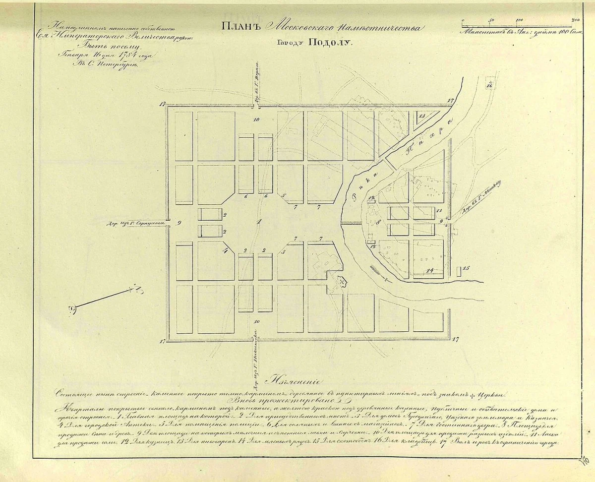 Самые ранние упоминания о деревне Подол относятся ко второй половине XIV века. В 1871 году по указу императрицы Екатерины II село было преобразовано в город, который вскоре начал отстраиваться по регулярному плану. Особенности рельефа позволили сохранить средневековую планировочную структуру на правом берегу реки Пахры, новые же строения возводились за селом. Городская территория была разбита на 20 кварталов, составивших вместе квадрат, ограниченный нынешними улицами Павлика Морозова (бывшей Верейской), Рабочей (бывшая Каноникинская), Стекольникова (Матросской) и Зеленовской. Сразу же за чертой города располагались огороды, риги и овины, выгонные земли, пахотные и сенокосные угодья. Развитию города в середине XIX века поспособствовало строительство новой дороги на Варшаву, к этому времени в Подольске работали 13 мануфактур, уездное училище, в 1819-1832 годах сооружен кирпичный с белокаменными деталями Троицкий собор, каменные торговые ряды.