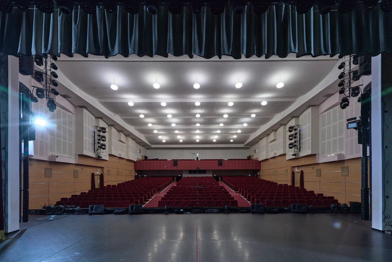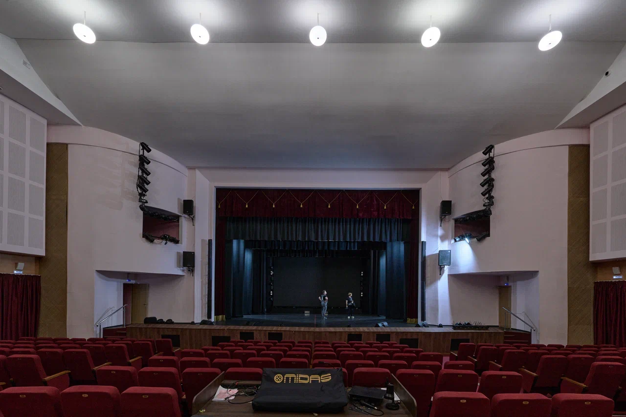 Клубная часть связана с театральным залом через буфет и главное фойе, которое заканчивается эстрадой для оркестра. Чтобы развести потоки зрителей, приходящих на следующий сеанс, в главном вестибюле четко разделены вход и выход, по этому же принципу спланирован гардероб, поставленный напротив зала и имеющий подходы с двух сторон для выдачи одежды. Зрительный зал на 1500 мест заканчивается большим порталом сцены. Над последними рядами — прямой балкон с невысоким ограждением, по бокам от сценической коробки — комнаты для артистов. Сохранился эскизный проект перспективы зрительного зала. Первоначально, по сторонам от портала находились выступающие ложи для светового оборудования, выполненные в характерных для конструктивизма формах, сочетающих полукруг и прямые опоры, в настоящее время их форма изменена.